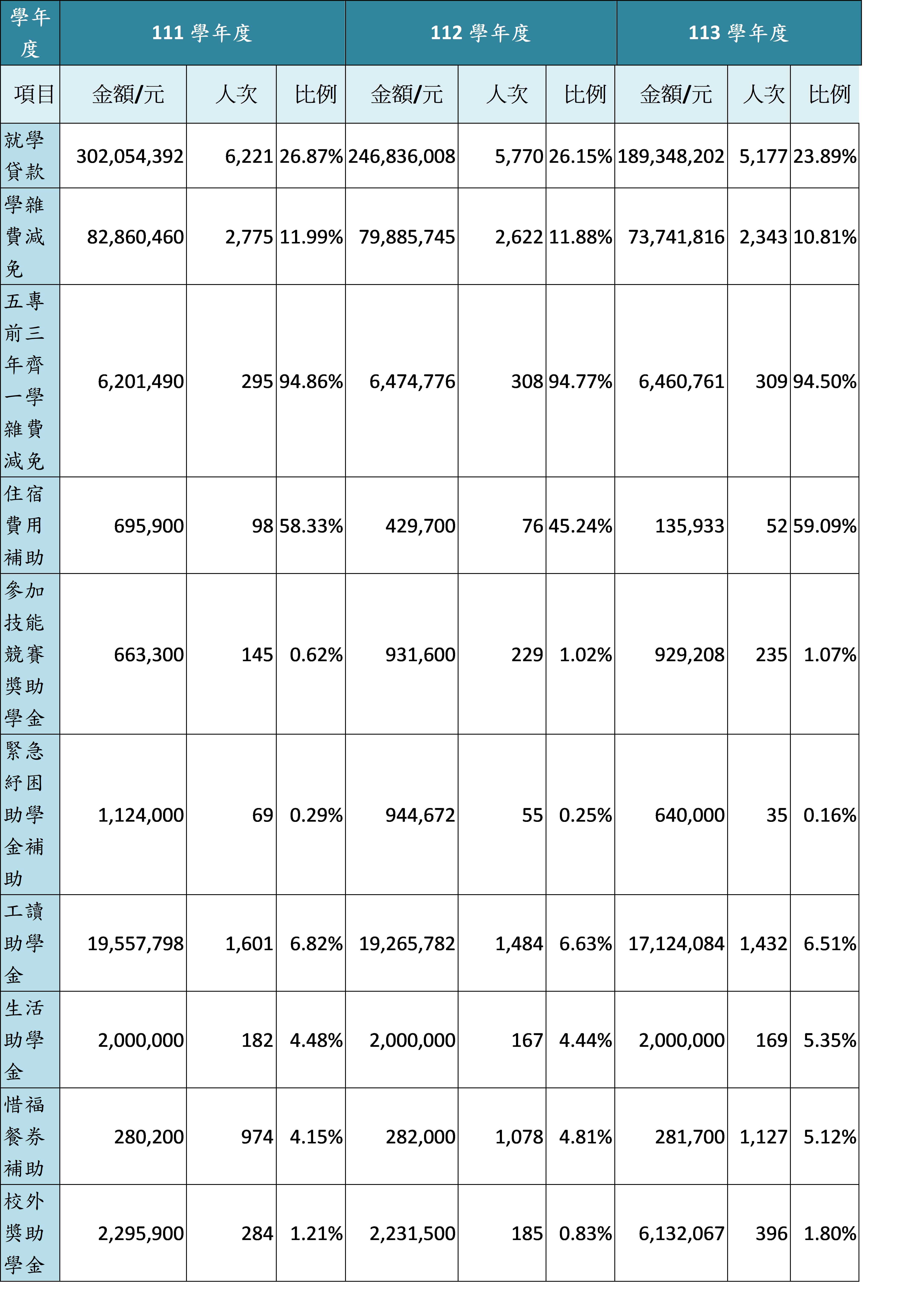 在校生申請就學貸款、獎助學金、學雜費減免之金額、人數與比率